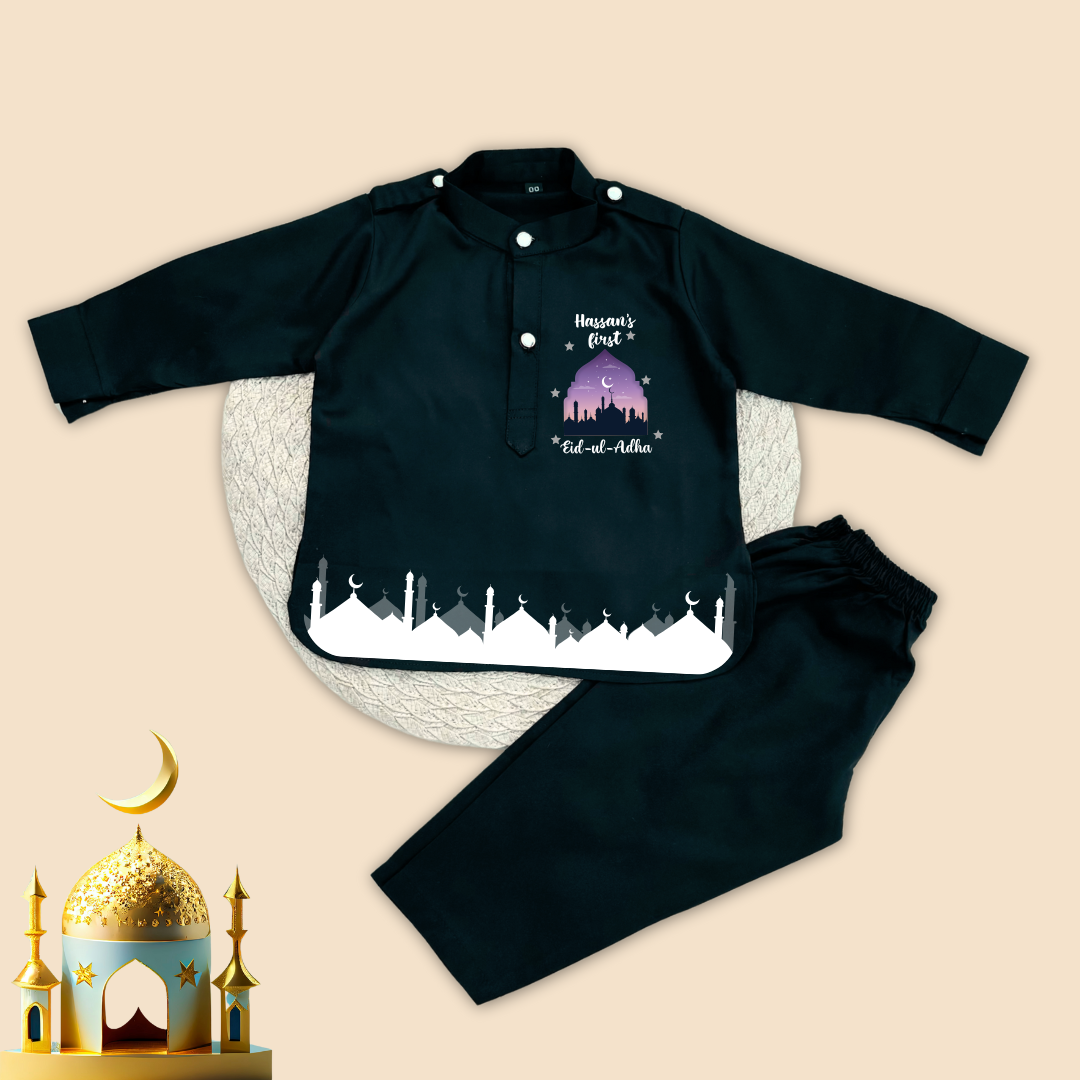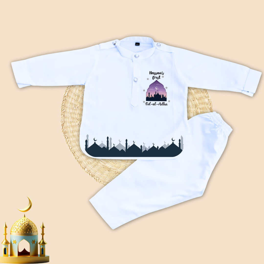 Whether it's for Eid prayers or family gatherings, our Customised Baby Pathani Set is the perfect choice to make your baby stand out and feel special on this auspicious occasion.
