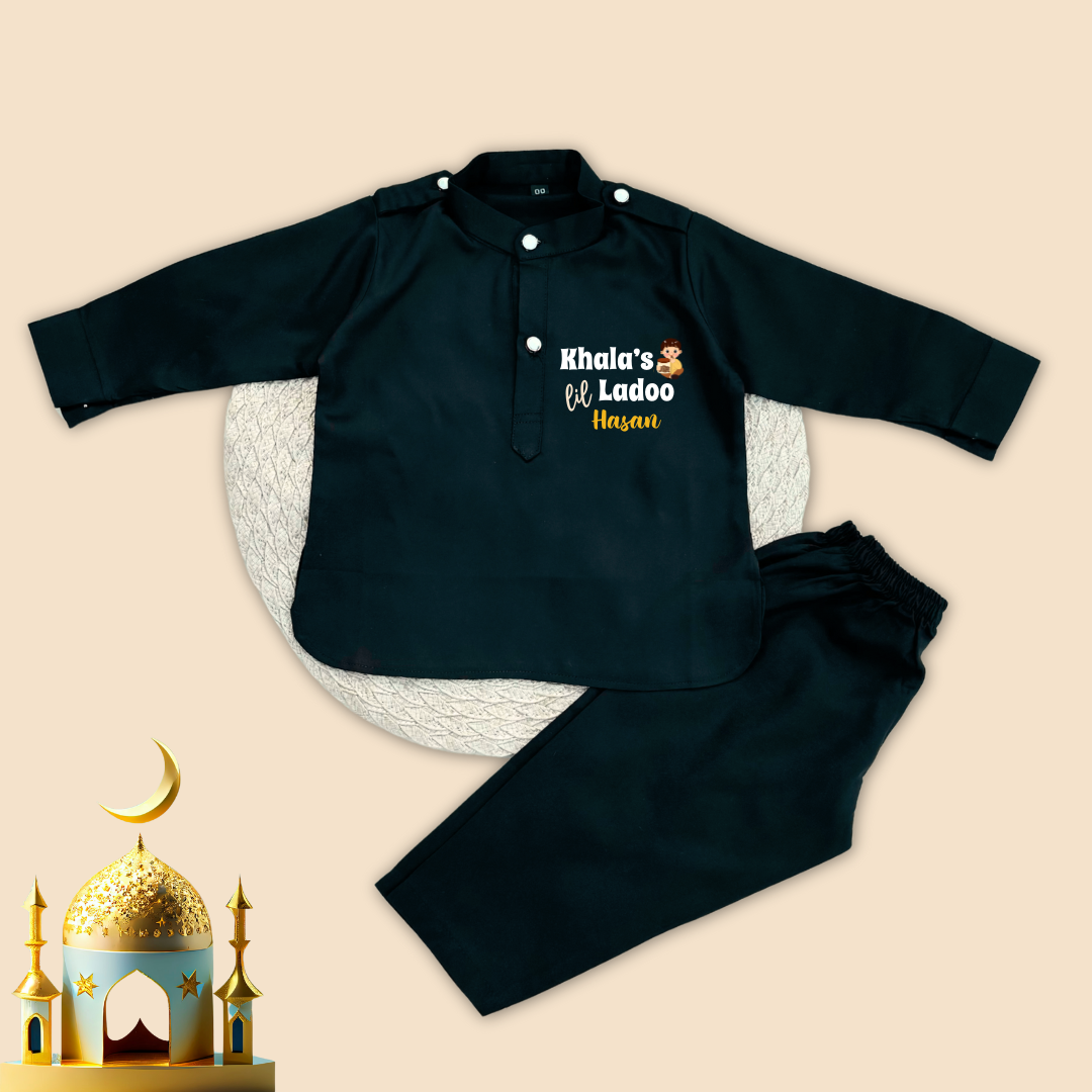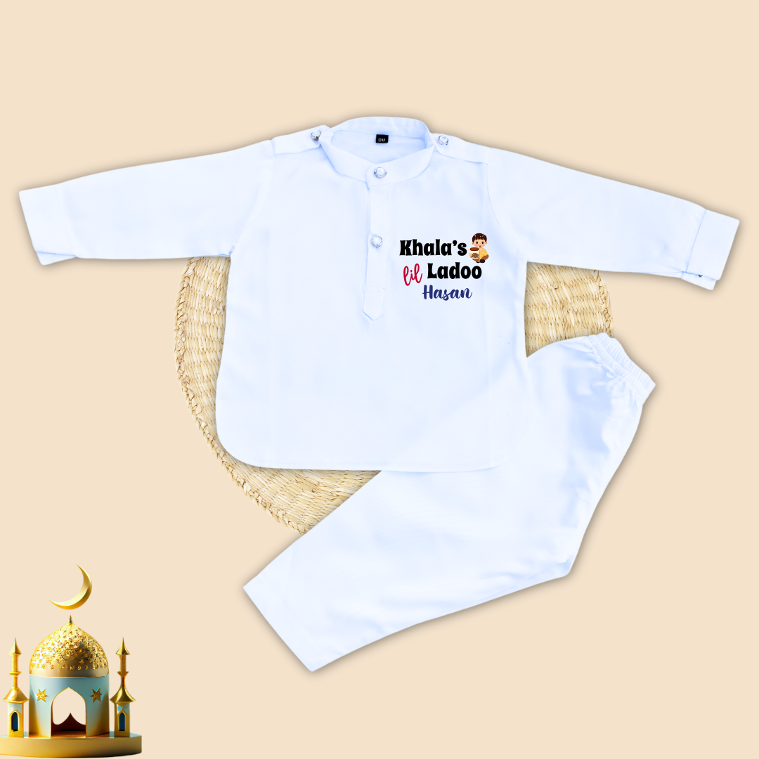 Whether it's for Eid prayers or family gatherings, our Customised Baby Pathani Set is the perfect choice to make your baby stand out and feel special on this auspicious occasion.
